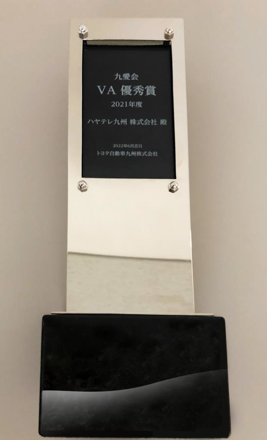 Our company and our affiliated company Hayatele Kyushu Co., Ltd. (location: Miyawaka City, Fukuoka Prefecture) received the “VA Excellence Award” from Toyota Motor Kyushu Inc. in recognition of our proactive VA* activities in FY2021.